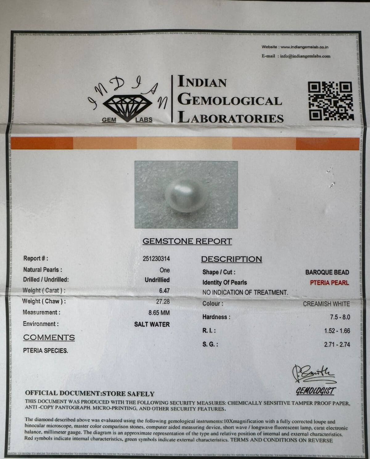 6.47 Carat/ 7.18 Ratti Natural Venezuela Saltwater Pearl (Moti)