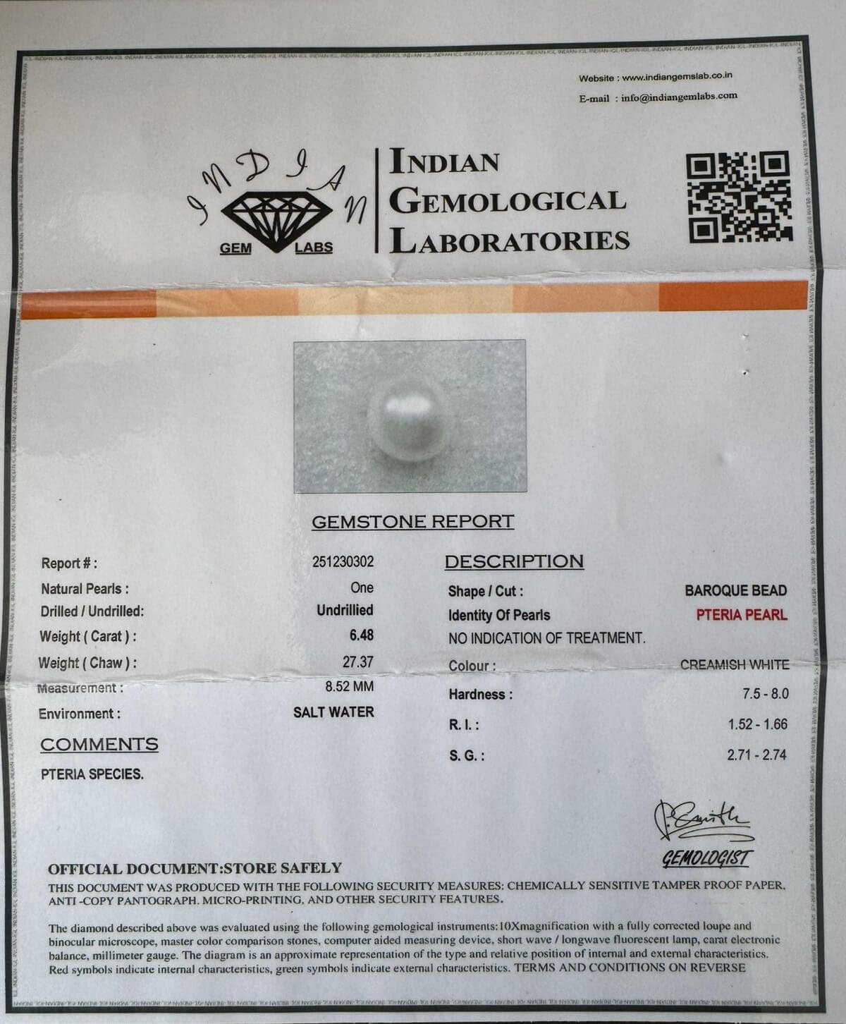 6.48 Carat/ 7.19 Ratti Natural Venezuela Saltwater Pearl (Moti)